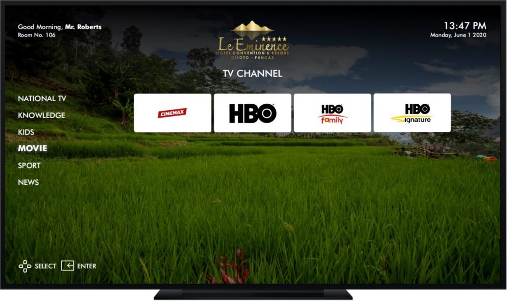 Live TV and Video-On-Demand (VOD) – Guests can enjoy their favorite TV channels or choose from a vast selection of movies and TV shows.